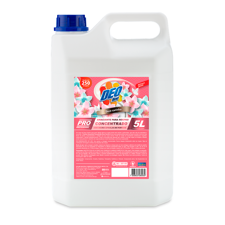 O Deoline Amaciante Concentrado – Doce Carinho da um toque de suavidade para deixar as roupas ainda mais macias e com agradável perfume, sem abrir mão da praticidade e economia. Os Amaciantes Concentrados Deoline formam uma camada protetora para as fibras do tecido e as tornam mais fáceis de passar. Ideal para o uso em lavanderias profissionais, hospitais, restaurantes, e demais estabelecimentos. Possui a tecnologia das cápsulas que, durante o uso das roupas, rompem-se e liberam ainda mais perfume! O cheirinho agradável de roupa lavada por muito mais tempo, você vai se surpreender.