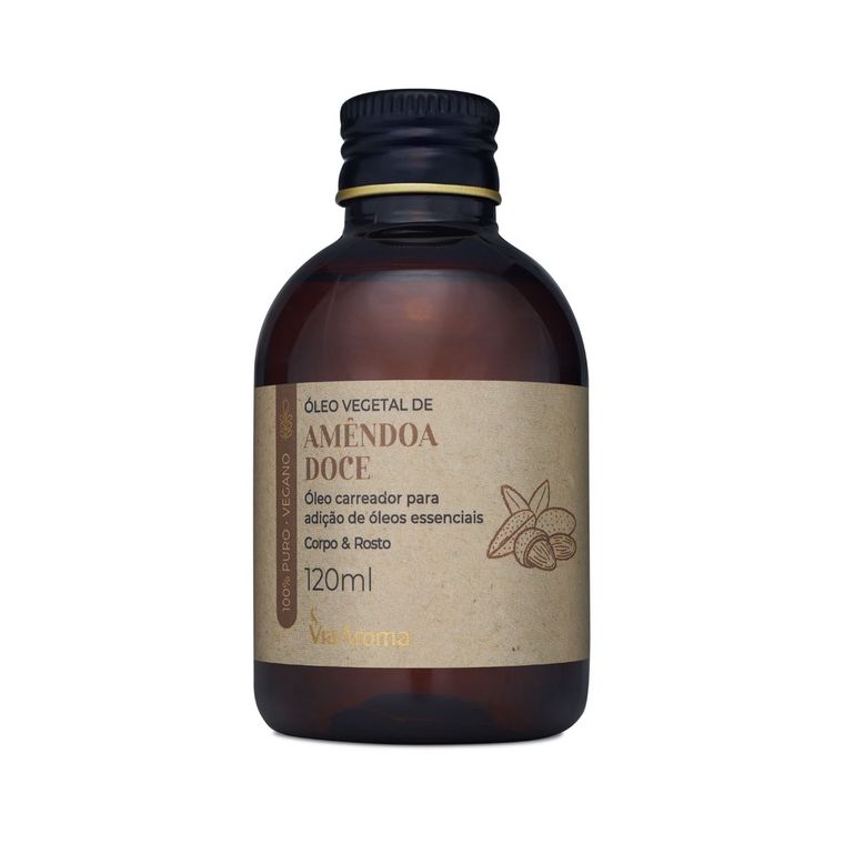 Óleo Vegetal de Amêndoa Doce (Linha Basic) Via Aroma - 120 ml Hidratante e calmante para a pele, o Óleo Vegetal de Amêndoa Doce Via Aroma 120ml é completamente natural, tem grande poder de nutrição e pode ser usado puro ou com a adição de óleos essenciais pra elevar a potencialidade da sua rotina diária de cuidados. Composição vegana e natural; Extraído por prensagem a frio; Use no rosto, corpo e cabelos; Excelente regenerador celular, ajuda a elasticidade da pele; Em massagens, bom para ajudar com estrias da gravidez; Emoliente, hidratante e rico em vitaminas; Possui alto teor de ômega 9; Efeito anti-inflamatório e calmante para a pele; Protege a barreira natural da pele; Recupera a oleosidade natural, diminuindo a perda de água; Previne o envelhecimento precoce; Dá brilho aos fios de cabelo e ajuda a reduzir o frizz.