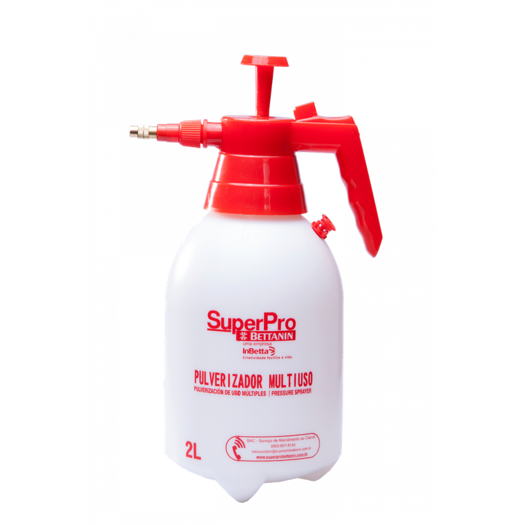 Pulverizador de plastico, com reservatorio na cor branca com capacidade para 2L de liquidos, com valvula pulverizadora de plastico na cor vermelha. Produto destina-se a pulverizacao de liquidos na jardinagem e para umedecer superficies a serem limpas.