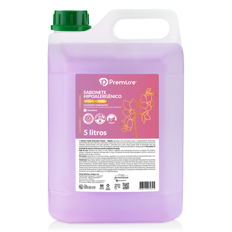 O Sabonete Líquido Glicerinado Premisse – Orquídea apresenta uma formulação suave, desenvolvido para peles delicadas. Sua fórmula é cuidadosamente balanceada, destinada à limpeza das mãos, do rosto e do corpo.